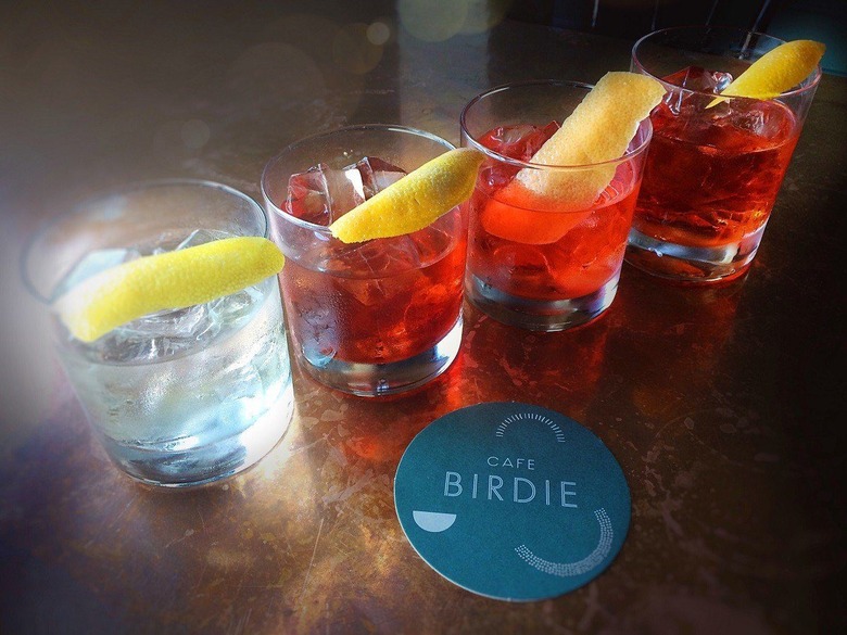 Bar director Alex Barbatsis is also going back to the classics at Café Birdie, where he's prepared a complete menu of classic Negroni variants. For Negroni Week, guests can choose from a list of classic variations, ranging from the Original Negroni (gin, sweet vermouth, Campari), a Cardinal (gin, dry vermouth, Campari), a Boulevardier (whiskey, sweet vermouth, Campari), and a White Negroni (gin, bianco vermouth, and Salers Gentiane). "We love the classic Negroni and its variations, so we wanted to put them in the spotlight at Cafe Birdie," says Barbatsis. "Pairing a bittersweet stirred cocktail with Cal-Mediterranean food is a delightful pairing, and we also appreciate the opportunity to share a bit of cocktail history with our customers."