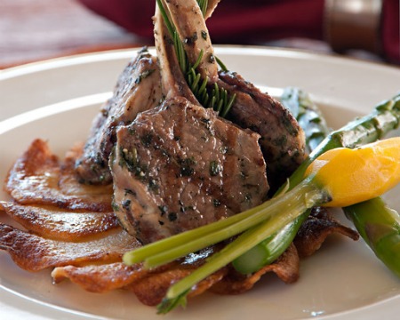 • Entrée: Rosemary-scented lamb chops on potato gaufrette with grilled vegetables.