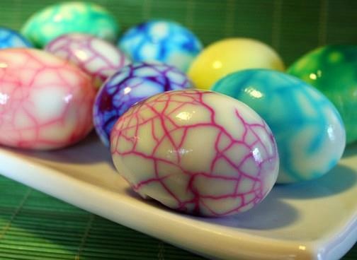 To get the effect of colored egg cracks on your hard-boiled eggs, simple crack the shell, steep in in food coloring and peel away the shell!