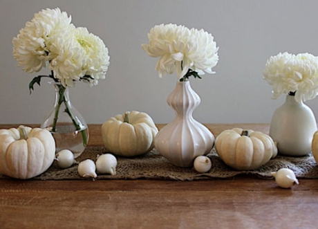 • Inspired by the darling mini white pumpkins still found in farmers markets, we kept things small and white and clustered orb-like clear and white bud vases from Heath Ceramics and Jonathan Adler around the squash and filled them with Chinese mums.