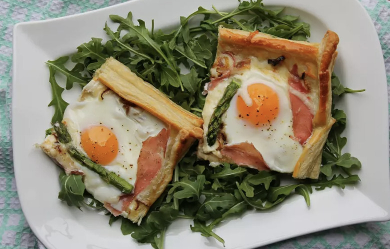 Store-bought puff pastry is a genius ingredient to have on hand and can be made into a number of different dishes. Just remember to defrost it for 15 minutes before rolling or cutting it out. This tart is a sophisticated option for a light dinner or brunch with an egg on top, garnished with prosciutto, asparagus and fontina cheese.