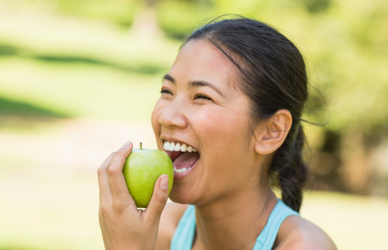 An apple a day can keep the stomach fat away, or at least hold off hunger pangs. "Apples are a great source of soluble fiber that help keep you feeling full and your blood sugar balanced," says Kaye Anne Starosciak, a registered dietician, sports nutritionist, and competitive runner. "The feeling of fullness you get from eating apples comes from more than just the fiber; the process of chewing the apple sends signals to the brain that it is satisfied."