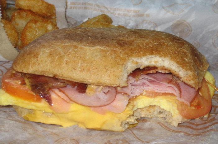 The mid-2000s was the era of "EXTREME," and in 2005, Burger King attempted to cash in by pairing that with the growing trend of fast food breakfast sandwiches by introducing the Enormous Omelet Sandwich. Comprised of eggs, cheese, bacon, and sausage on a sesame-seed roll (add ham and you've got the Meat'normous Omelet Sandwich), this artery-clogging overload performed well at first, but sales fizzled out once consumers realized that they probably didn't want to eat 330 milligrams of cholesterol for breakfast.