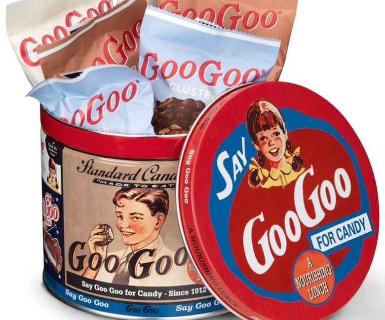 In production since 1912, the GooGoo cluster has the distinction of being the first "combination" candy bar, meaning it contained several different components instead of just chocolate. Created by Howell Campbell and the Nashville-based Standard Candy Company, they were originally sold unwrapped in glass jars. These disk-shaped bars contain roasted peanuts, caramel, marshmallow nougat, and a milk chocolate coating, and varieties include GooGoo Supreme (with pecans instead of peanuts) and Peanut Butter GooGoo (with peanut butter instead of nougat and caramel).