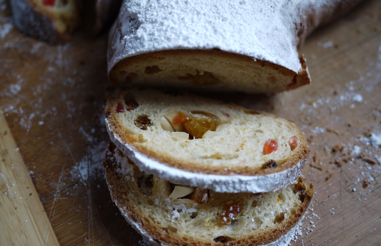 In Germany, no Christmas is complete without stollen, a fruitcake with candied and dried fruits, nuts, and spices topped with confectioners' sugar. Other popular German Christmas treats are lebkuchen, which is similar to gingerbread; springerle, an embossed biscuit; and weihnachtsplätzchen, or assorted Christmas cookies. Main dishes can include carp, roast goose, venison, weisswurst, and schäufele (corned roast ham) with potato salad on the side. To wash it all down, there's feuerzangenbowle (hot mulled wine with flaming sugar melted into it) and glühwein, or hot spiced wine.