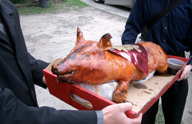 Lechon, or whole roast suckling pig, is a common centerpiece of a Filipino Christmas table, along with ham, queso de bola (edam cheese), pancit (a noodle dish with meat and vegetables), a type of chorizo called morcon, a stew-like beef dish called machado, and a goat stew called kaldereta. Desserts include puto bumbong (sweet purple rice with sugar and coconut) and bibingka (a layered dessert made with rice flour, sugar, butter, and coconut milk).