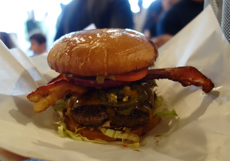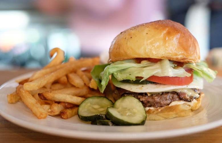 The idea of the "chef-inspired" burger, in all its renown and prominence, can be hit or miss these days. Lately, it seems like all chefs feel like they have to have a burger on the menu. But while some are just paying lip service to the trend, some of them really, really hit the mark. In that regard, it's very hard to disregard the importance of the Original db Burger, created by esteemed French chef Daniel Boulud for his db Bistro Moderne. A sandwich that's simultaneously very American and very French, the db Burger is a mixture of grilled beef and braised short rib — the ultimate upscale juicy Lucy, so to speak — with a foie gras center. This is a burger that's as tall as it is wide. There's a Dijon mustard layer on the bottom layered with tomato compote, chicory, and the gorgeously tall "patty" — and all that's topped with Cheddar, red onion slices, and grated horseradish. Indulgent? You bet. Juicy? Absolutely. Salty, sweet, and savory with a bit of a bite? Oh yeah.