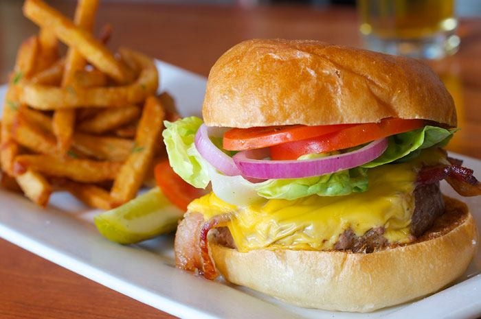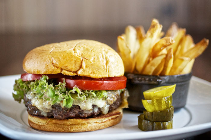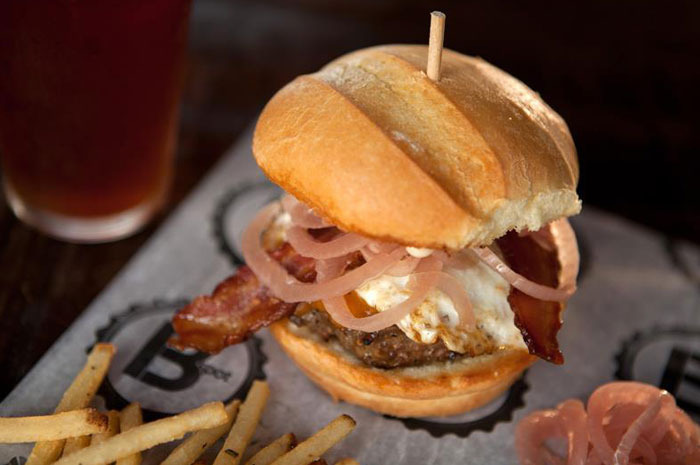If you like a good beer with your mammoth of a bacon cheeseburger, than Pangaea Bier Cafe is the place for you. With a long list of rotating craft ales — both local and international — you'll have your pick for creating a great burger and beer combo. Whether you're into saisons, IPAs, or pilsners, the Pangaea Burger is sure to make a great mate. For this beloved sandwich, an all-Angus beef patty is grilled to your preferred temperature and topped with bacon, Cheddar, lettuce, onions, tomato, and house-made pickles and sauce. The brioche bun is perfectly domed, crispy fries come on the side, and the whole plate is quite a sight to behold.