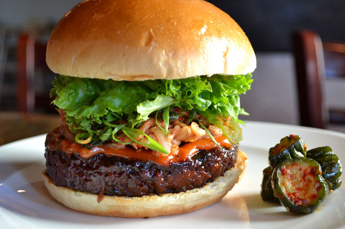 Bachi Burger is known for their "Asian-style burgers and unique beverages," but this place is about more than the food: diners can feel good about the eatery's sustainable practices. They actually separate their post-consumer recyclable waste daily, recycle their used oil for renewable energy, and transport their compostable waste to local farms. It might seem they wouldn't have any time left over to make great burgers, but one bite of the Kalbi Burger will put that anxiety to rest. An Angus beef patty is topped with green onions, their house-made kimchi, lettuce, special "Kalbi" marinade, and kochujang mayo (made with Korean chile-rice-soybean paste). It's served on a white bun with a side of pickles, and is one delicious burger.