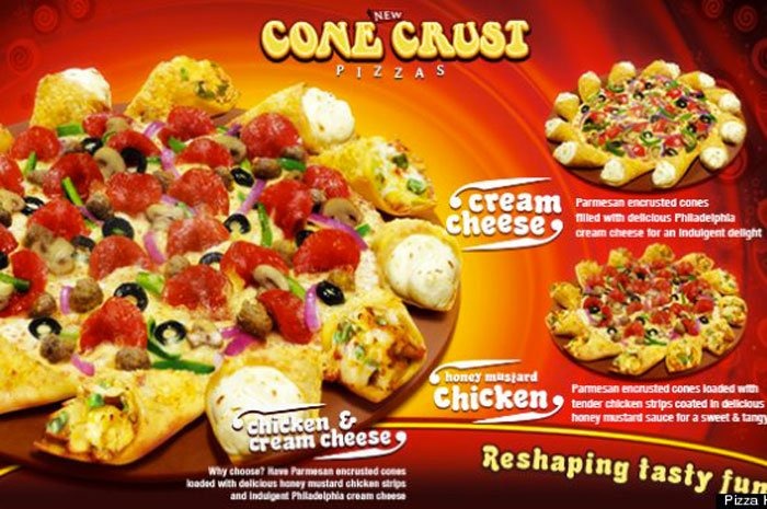 International Pizza Huts have a lot of freedom to sell basically any type of pizza they want. Case in point: those Singaporean monstrosities and these "Cone Crust" ones from the United Arab Emirates. Parmesan-encrusted cones come loaded with Philadelphia cream cheese, honey-mustard chicken strips, or both. These pizzas aren't available any more, but they were surely legendary in their day.