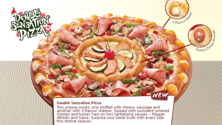 Pizza Hut Singapore has, for some reason, been ground zero for completely absurd pizzas, and the fact that it's Pizza Hut Singapore makes it all even more absurd. The company has unveiled such insane creations as the Seafood Mix Pizza (shrimp, squid, tuna, onions, broccoli, and a healthy dose of mayonnaise) and the Ring of Fortune Pizza (pineapple, barbecue chicken, and mushrooms atop "crispy dough" with a crust stuffed with pumpkin and taro pastes, on a pizza shaped like a Chinese coin), but the Double Sensation takes the cake. Here's the rundown: