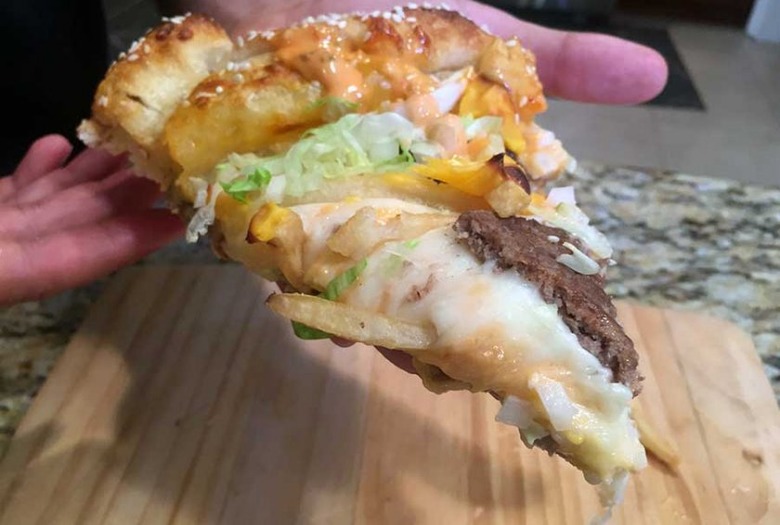 The crazy folks at Foodbeast (creators of the two foot Taco Bell burrito) decided to combine two of America's great loves — pizza and Big Macs — and the results were certainly ridiculous. To make this creation, they slathered pizza dough with McDonald's special sauce, then topped that with Big Mac patties, cheese, more special sauce, and onions. This got topped with more pizza dough, chopped up patties, fries, and more special sauce before being sprinkled with sesame seeds and baked. Finally, some shredded lettuce completes the dish. It's a mashup for the ages.