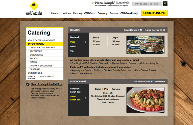 If you want CPK to cater your next gathering, there's a wide menu of appetizers, salads, sandwiches, pastas, pizzas, and desserts that it can bring.