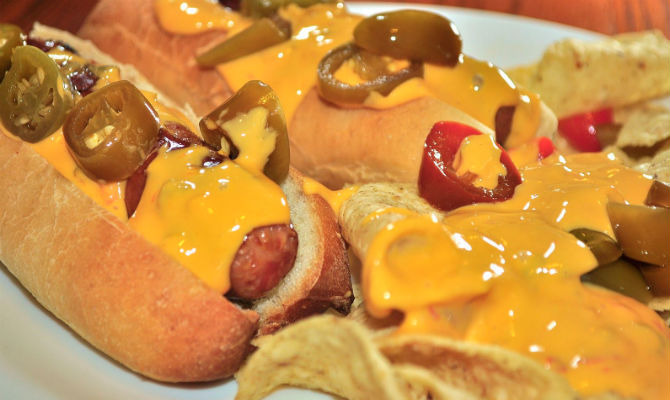 Ricos calls themselves the "originators of concession nachos," and they call their product "an aseptically processed ready-to-serve cheddar and jalapeño cheese sauce." The ingredients include cheese whey, modified food starch, partially hydrogenated soybean oil, Cheddar cheese, jalapeño peppers, sodium phosphate, salt maltodextrin, vinegar, MSG, mono and diglycerides, sodium stearoyl-2-lactylate, natural flavors, and artificial colors.