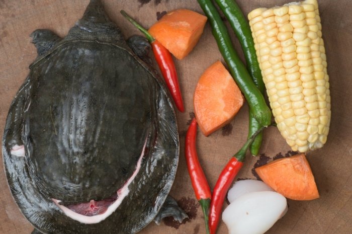 There's a surprising amount of meat on a turtle, so you're going to want to chop it up, give it a boil, then shred the meat — similar to how you'd treat iguana. The texture is comparable to frog legs or lobster, and it goes great in a gumbo.