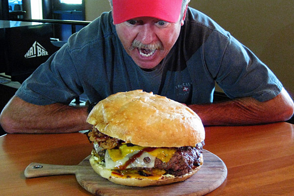 An undefeated burger challenge can be found at That Bar in Danville, Calif., 30 minutes outside of San Francisco. Appropriately named "That Burger," the monstrous mass of meat and cheese measures approximately 1 foot in diameter, and includes two 100 percent Angus beef patties, one of which has a hole in the middle where a grilled cheese sandwich is placed. Each patty is topped with four different cheeses Cheddar, American, pepper jack, and Swiss and a woven bacon patty. Finally, the burger is topped with shoestring fries and doused in BBQ sauce, with an appropriately sized bun. The challenge includes one-quarter pound each of fries and onion rings on the side.