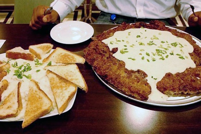 The challenge includes a 64-ounce chicken-fried steak, served on an extra-large pizza pan, measures 14 inches in diameter and weighs about 10 pounds with gravy. But wait, that's not all: You must also finish the Texas-sized sides, which include four pounds of mashed potatoes and 10 pieces of Texas toast.