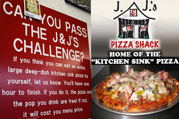 Perhaps the oldest undefeated eating challenge in the country, the Kitchen Sink challenge at J&J's Pizza Shack in Indiana has confounded eaters for 27 years. The pizza is the brainchild of John Bogdan, the now-retired founder of J&J's, who created the 16-inch round deep-dish pizza. It includes sausage, pepperoni, mushrooms, green peppers, onions, green olives, black olives, ham, Canadian bacon, bacon bits, and mozzarella cheese; it weighs about 6 pounds and must be completed within one hour.
