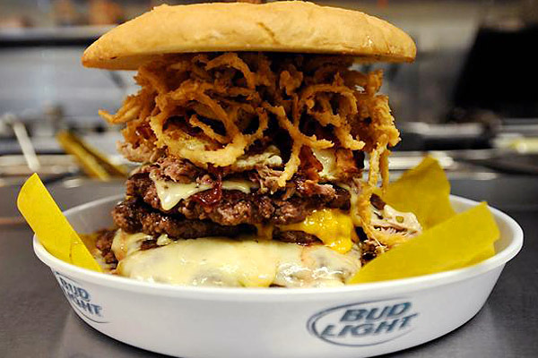 The Unnecessary Roughness includes five-plus pounds of meat, including griddled burgers, bacon, pulled pork, three cheeses, onion rings, and fried eggs, all stacked between two buns. To complete the challenge, a contender not only must finish the burger but also polish off a full pound of french fries, all within 60 minutes. If someone can conquer the Hail Mary Challenge, they will be rewarded with their meal on the house (a $50 value) and $50 in food and drink every month for a year. Best of all, you will become legend in your own time: The Stadium Grill will name the burger after the first victor.