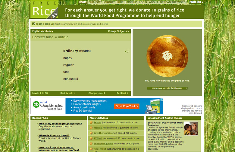 For every quiz question you answer correctly on freerice.com, 10 grains of rice will be donated to the United Nations World Food Programme. If you get an answer wrong, you're given an easier question, and if you get one right, you're given a harder one. Use this as fun brainteasers and a simple way to give back.