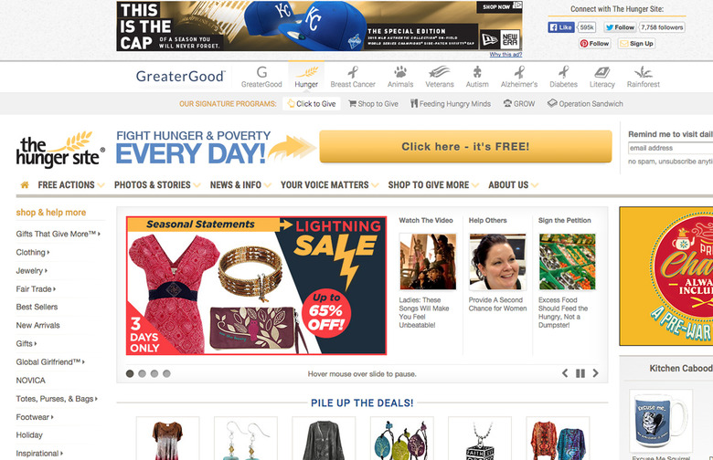 The Hunger Site is an online activism website that sells fair trade items, including seasonal home décor, African products, and everyday goods, to benefit participating charities like Feeding America, Millennium Promise, and Mercy Corps. Proceeds are split between the organizations and go toward fighting hunger in the United States, as well as in more than 74 countries around the world.