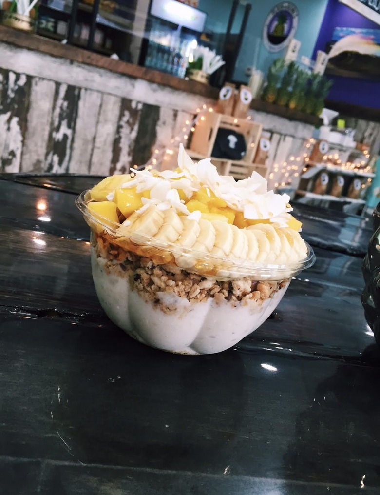 So what's on the menu? Here's a taste: the Pura Vida bowl is acai topped with granola, strawberries, blueberries, and honey; while the Electric Mermaid Pitaya bowl is topped with coconut flakes, honey, kiwi, mango, pineapple, and granola. The toppings tend to be similar, fruits, granola, healthy grains, and a little sweetness.