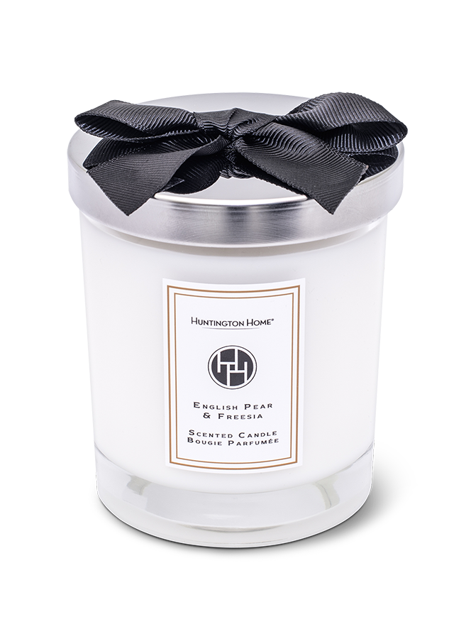 Aldi's Huntington Home candles come in a satin-finish glass with a silver lid topped with a black bow. U.K.-based luxury brand Jo Malone's candeles come in practically the same packaging. Their scent profiles are also virtually identical to the Aldi brand. Jo Malone also does an English Pear & Freesia scent, as well as a Lime Basil & Mandarin, and a Black Pomegranate, which they call "Pomegranate Noir."