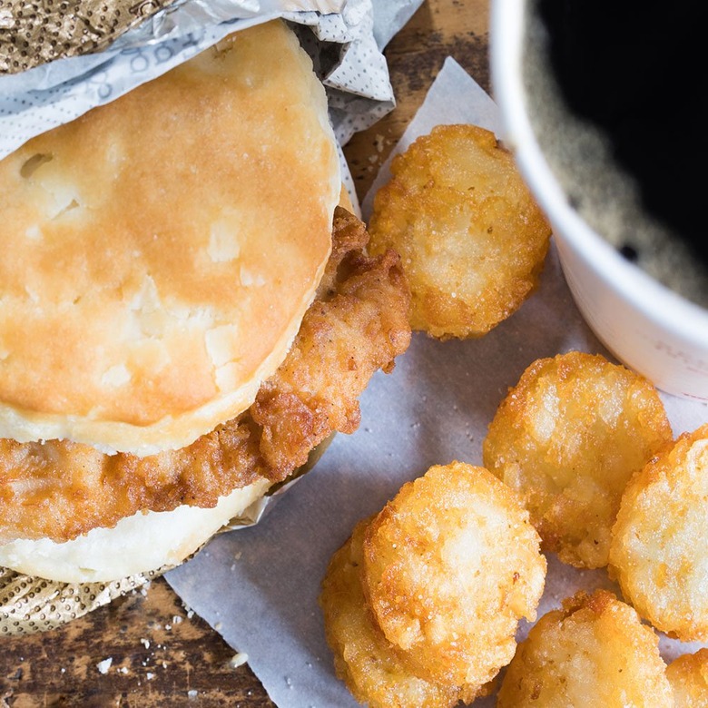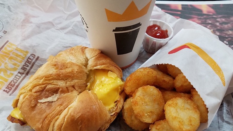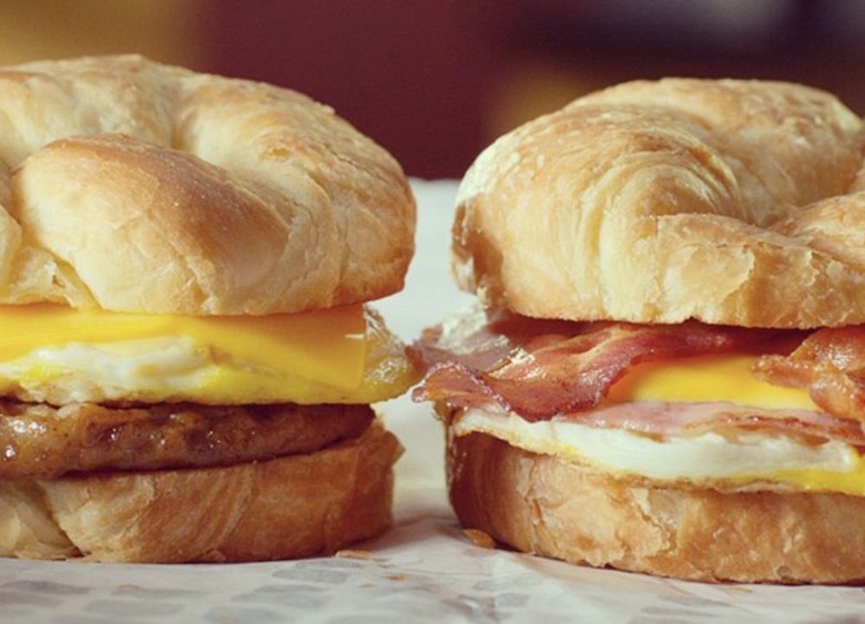 Hardee's and Carl's, Jr. have hitched their breakfast wagons to the power of the almighty biscuit, which they offer with sausage, bacon (or both), egg, and cheese, or topped with gravy. Breakfast sandwiches served on sourdough toast are also perfectly tasty, as are breakfast burritos (the Big Country, with egg, sausage, ham, hash browns, cheese, and cream sausage gravy, is a beast), but this chain also offers what might be the most behemoth breakfast offering in the industry: the Breakfast Burger, essentially a bacon cheeseburger with eggs and hash browns.