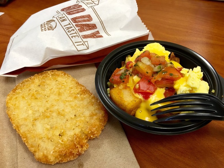 Taco Bell took a completely different approach to breakfast when they introduced it in 2014, as you might have noticed, with offerings including waffle tacos and loaded breakfast CrunchWraps. The waffle tacos (and their follow-up, biscuit tacos) have fallen by the wayside, and today the menu is dominated by breakfast burritos, breakfast tacos, and those CrunchWraps. But Taco Bell excels in letting its customers customize their breakfast more than any other chain; for example, you can have any combination of steak, egg, cheese, pico de gallo, nacho cheese sauce, sour cream, and potatoes in your Grande Scrambler wrap, and add in guacamole, jalapeño sauce, three-cheese blend, or bacon for an extra charge. They're also constantly innovating; their newest breakfast item, the Naked Egg Taco, replaces the taco shell with a fried egg. And that breakfast CrunchWrap, with bacon, egg, cheese, a hash brown, and creamy jalapeño sauce, just might be the tastiest breakfast item on the market right now.