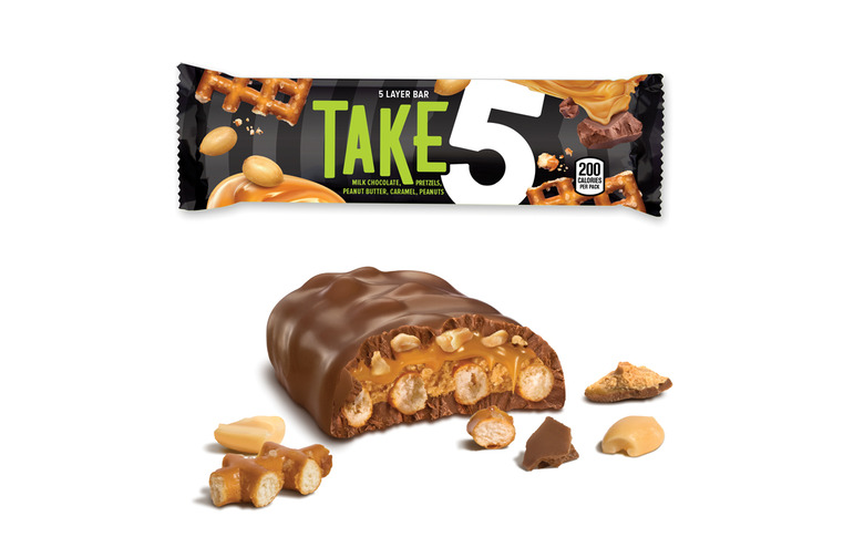 The "5" in Take 5, which recently got some new packaging, represents all of its components: peanuts, pretzels, caramel, peanut butter, and real milk chocolate. Is there anything that sounds better than that?