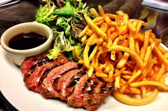 Peter Luger is a New York institution. Their classically simple menu includes aged steaks, creamed spinach, German potatoes, and, of course, French fries. Jody Storch, proprietor, explains that the fries are cooked in steak fat, served piping hot, and salted generously. Storch says this preparation "gives it an extra kick."