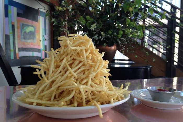 A mountain of thin, crisp shoestring fries graces tables at San Francisco's Zuni Cafe. They are salty and crispy, but diners should be cautioned not to fill up on them, as the rest of the menu is delicious as well.