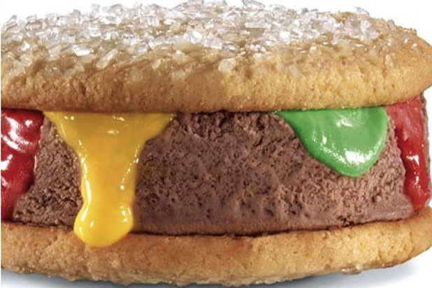 In May, Carl's. Jr. began testing the "ice cream brrrger" in select markets across the country. The new item on the dessert menu includes a scoop of chocolate ice cream topped with red, green, and yellow frostings, and sandwiched between two sugar cookies to resemble a burger.