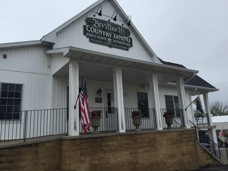 Breitbach's, the oldest restaurant in Iowa, was established in 1852 in Balltown under a permit issued by President Millard Fillmore. Employee Jacob Breitbach bought the restaurant from the original owner in 1862 and it's been run by the family ever since (now on the sixth generation of ownership). The first of two fires that destroyed the building happened in 2007, and the restaurant was rebuilt immediately with the help of hundreds of volunteers from the community. Ten months later, the second fire struck, but the community rallied together once again to rebuild Breitbach's.