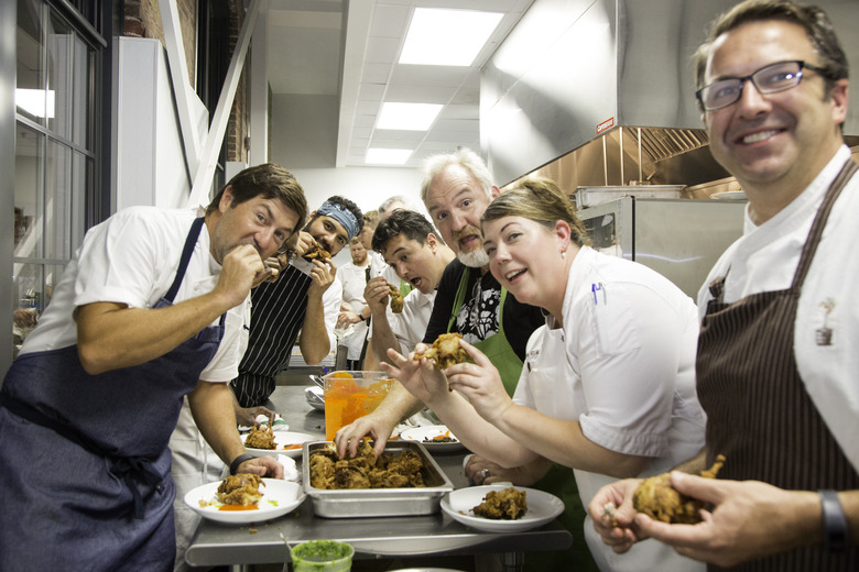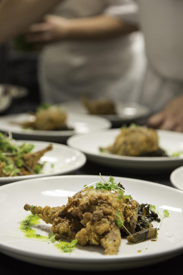Chefs in the kitchen feasted on Art Smith's Fried Quail Stuffed with Cracklin-Cornbread Dressing.