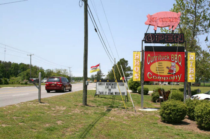 Driving down Route 158 south of the Virginia state line brings you into Currituck County, North Carolina and what could be called Barbecue Row, which extends all the way into the Outer Banks. A smoky culinary feast for the senses awaits you as you pass down home establishments with signs extolling the particular virtues of their smoked meats. Starting at the north end of the county, I ate my way south and discovered why this, as much as anything else, is a part of Americana.