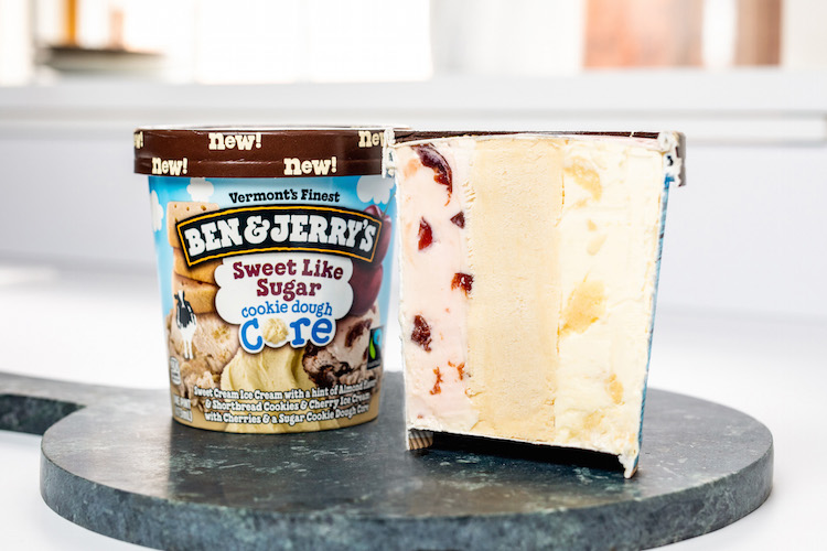 Sweet Like Sugar Cookie Dough Core is made with sweet cream ice cream with a hint of almond flavor, shortbread cookies, cherry ice cream with cherries, and a sugar cookie dough core. Wake & "No Bake" Cookie Dough Core features vanilla ice cream with peanut butter cookies, peanut butter ice cream, fudge chips, and a no-bake cookie dough core.