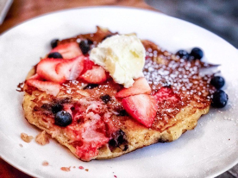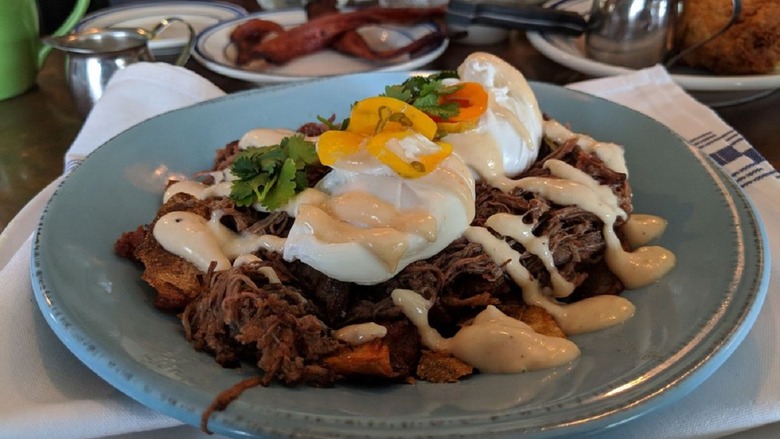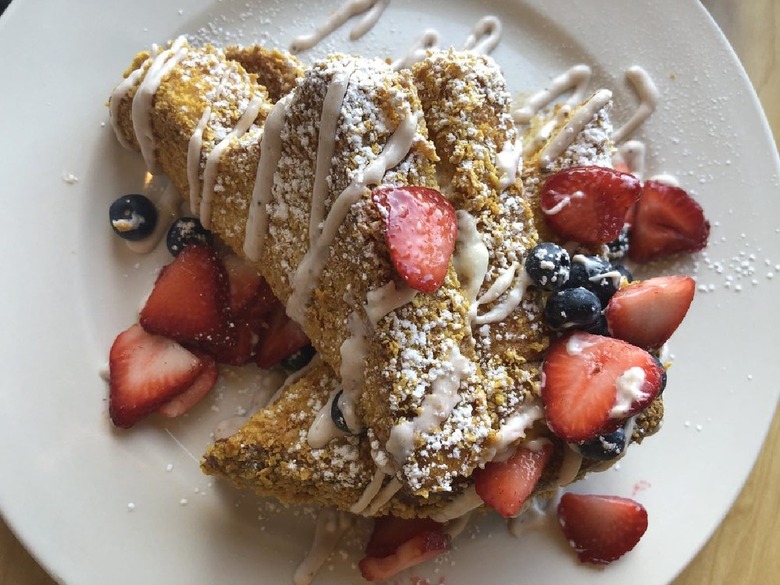 "The early bird gets the pancake" is the motto at this Omaha, Nebraska, brunch spot — and there are a lot of pancakes on the menu. Some creative options include the "cereal killer," which comes with sweet vanilla glaze over your choice of childhood breakfast favorites including Fruity Pebbles, Cinnamon Toast Crunch or Cocoa Puffs. There's also s'mores, pecan pie, blueberry, chocolate, cinnamon roll and PB&J varieties. Can't choose? Go for a flight of three flavors. The menu at Early Bird also boasts breakfast nachos; lavash flatbread topped with scrambled eggs, chorizo, jack cheese, green chilis and spicy hollandaise; six types of eggs Benedict; and "the Bob," the restaurant's famous gargantuan glazed doughnut. Thirsty? How about an extra-large bloody mary garnished with a chicken sandwich and tater tots?