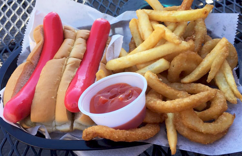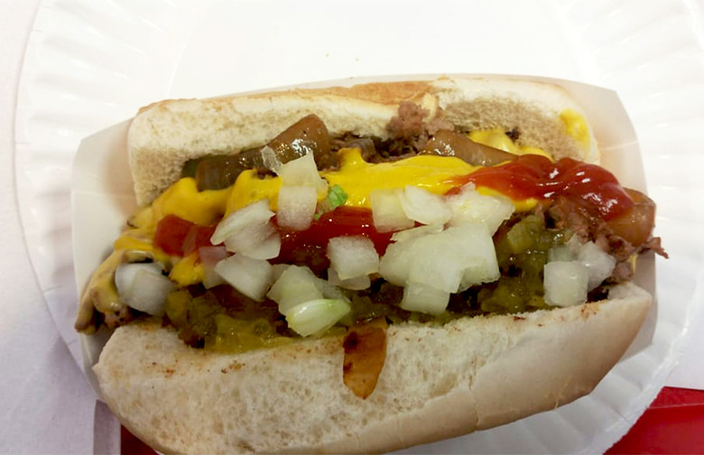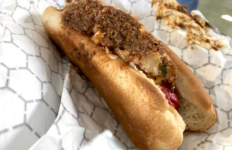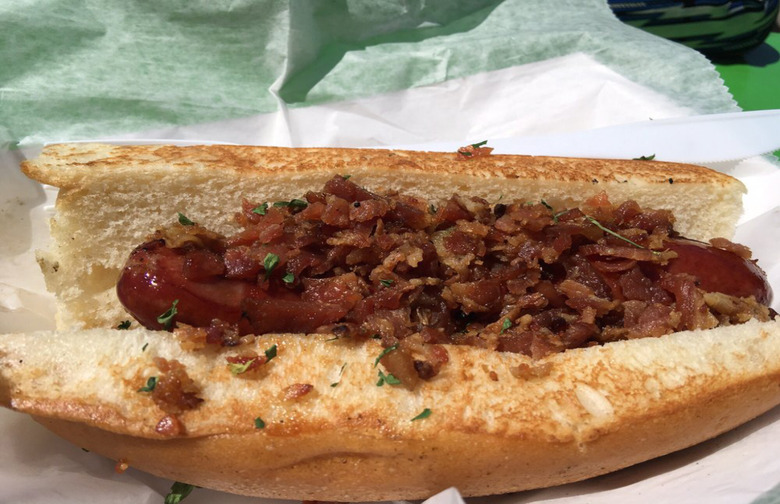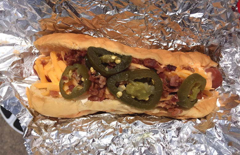 Is there anything to say about Pink's that hasn't been said? Hard to imagine. Even detractors define themselves by it. But you won't find many of those — just check out the line at this family-owned hot dog stand that has been around since 1939. At our last count, owner Richard Pink said he offers 35 varieties of hot dogs and toppings and sells on average about 2,000 hot dogs a day. Credit much of Pink's success to its chili — it once led then New York Times restaurant critic Ruth Reichl to go dumpster diving to figure out the recipe (true story). And while he wouldn't divulge its ingredients, in an interview with The Daily Meal, Pink did note "that it needs to be relatively smooth, but still have enough texture to make it stand up to hot dogs and hamburgers." For all the bacon-, sour cream-, guacamole-, pastrami-, and nacho cheese-topped hot dogs, the Three Dog Night is the right move. This "dog" (shouldn't it really be called a meal?) features three hot dogs wrapped in a giant tortilla with three slices of cheese, three slices of bacon, chili, and onions. It's a best-seller that was born the Laker Three-Peat Dog, was then renamed after Matrix Reloaded, and after the movie had its run, finally settled into a permanent homage to the '70s rock band.