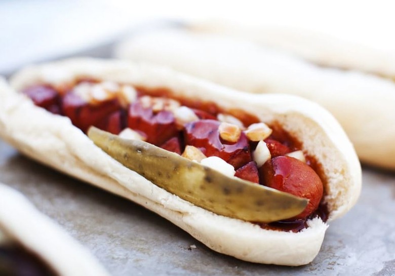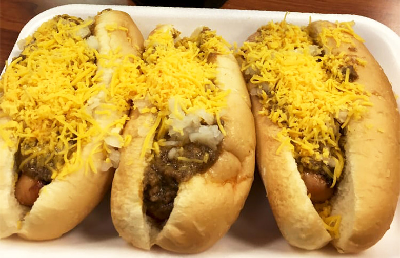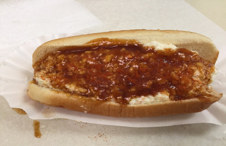 Gus's is home to the Greek Dog — in fact, it's "the lone surviving old-school Greek hot dog place in downtown Birmingham," according to Serious Eats. To make their Greek Dog, char-grilled Zeigler pink franks are topped with seasoned ground beef, sauerkraut, a few chopped onions, and a special sauce that was formulated by Gus Alexander himself when he opened the stand around 1940 — a cross between barbecue sauce and New York-style stewed onions. The atmosphere has an unassuming air; it's small and quaint, with a TV in the corner, making it clear that, in here, it's all about the dogs.