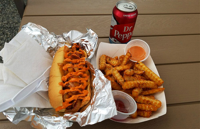 Family-owned Lincoln hot dog shop FlyDogz serves a wide variety of hot dogs — pork, all-beef, hot link, Cheddar hot link, beef hot link, jumbo, veggie, turkey, footlong, and all-natural grass-fed Piedmontese beef — and more than 20 toppings are available. You're going to want to try their signature FlyDog, though: a jumbo hot dog topped with cream cheese, jalapeños, nacho cheese, tomato, lettuce, and onion, served on a burger bun.
