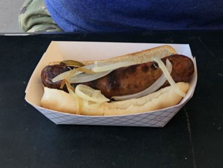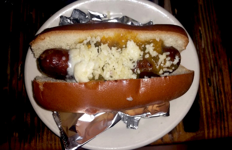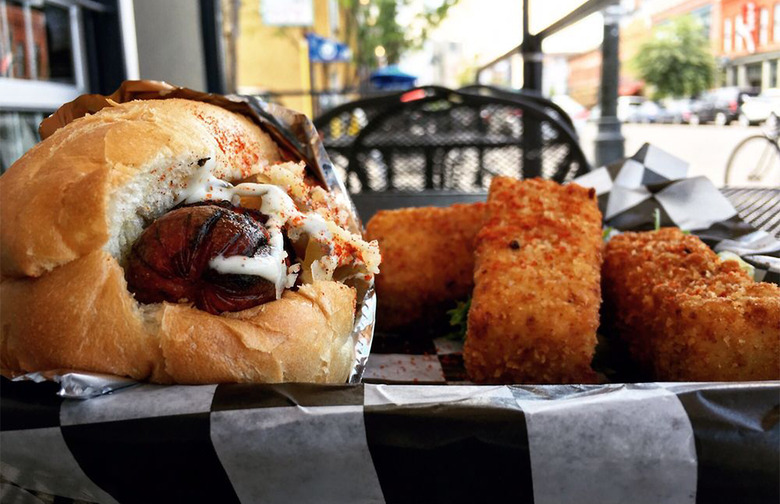 Seven different sausages are available (including bratwurst, jalapeño Cheddar brat, and two different vegan options), and they're served on a warm, freshly-baked roll and topped with your choice of onions, kraut, spicy kraut, hot giardiniera, relish, or short peppers. But if you want to go upscale, you can also choose from 15 different "styled sausages," including the popular Bunkhouse: a bacon-wrapped cheddarwurst topped with fried jalapeños, Cheddar, barbecue sauce, and guacamole.