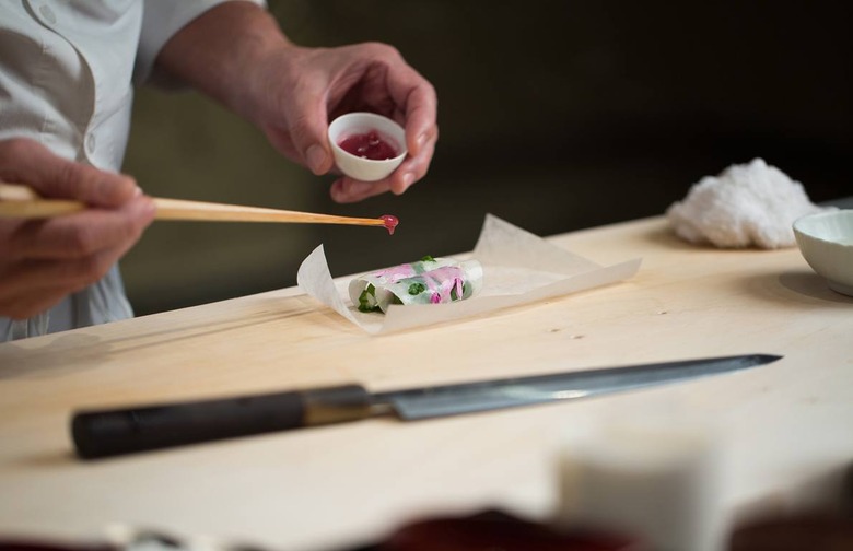 Former New York Times critic Sam Sifton took Masa down to three stars from the four given to it by his predecessor, apparently in part because they made him wait outside when he showed up early, didn't explain all the dishes, and didn't pay him much attention after dessert. That doesn't seem to have discouraged the high-rollers who crowd the sushi bar or — losing some of the immediacy of the experience — sit at one of the small tables. Masa's toro-stuffed maki rolls have been known to inspire lip-twitching and eye-rolling, and the toro with beluga caviar seems almost worth the price of admission. And what a price that is: The swanky Time Warner Center setting and elaborate omakase-only menu is accompanied by a high bar for entry. At an astonishing $595 per person before beverages (service included; they did away with tipping last year), you're looking at a bill that can easily total more than $1,500 for two.