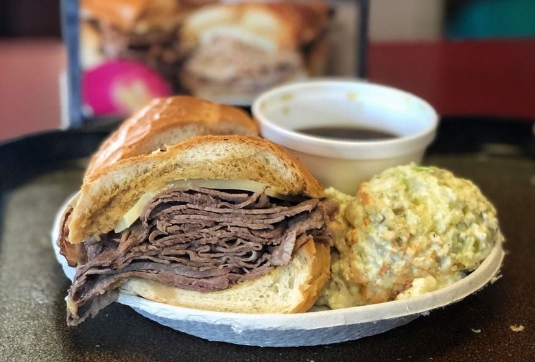 Chaps Pit Beef started out as a humble shack serving up pit beef, a food you'll only find in Maryland. Over the years, its popularity grew (along with its menu), and the size of the building has expanded substantially as well. The crowds still line up to eat here, and it's one of those restaurants worth waiting in line for. The classic pit beef sandwich is made by rubbing whole bottom round roasts with salt, pepper, paprika, thyme and onion powder before grilling them over a 500-degree charcoal pit. Once a nice crust is developed, the cooked portion is sliced and then put back on the grill, and the chunk that's sliced off is thin-shaved and grilled some more before being tucked into a kaiser roll. Some mayo-kicked horseradish (known as "tiger sauce") and raw onions complete the dish.