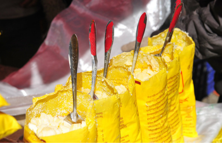 A Tibetan baby's first foray into the world of food starts at a mere 4 days old, when a piece of zamba — barley, wheat, corn, and peas stirred, fried, and ground into flour and mixed with yak butter — is stuck to the infant's forehead as a ritual to denote purity. (Photo Modified: Flickr/melanie_ko)