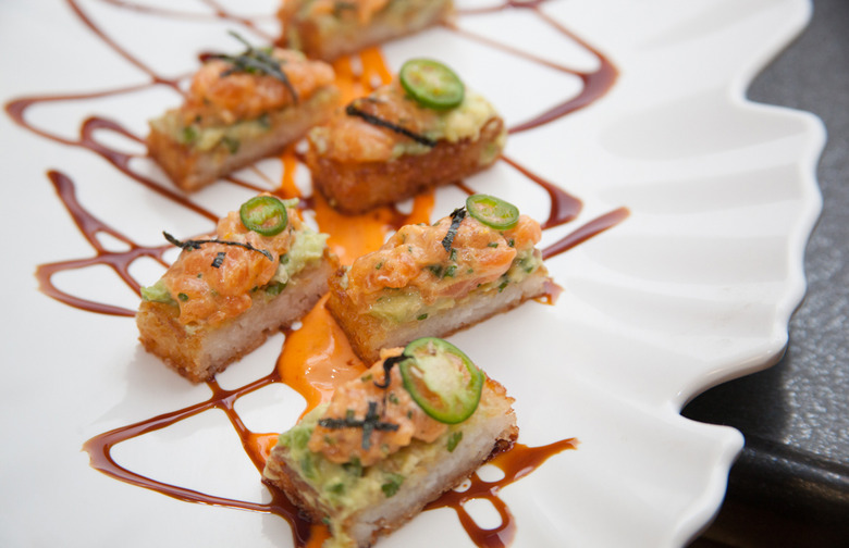 Chef Ellis' Spicy Salmon Tartare features rice cake, Sriracha, and soy caramel.