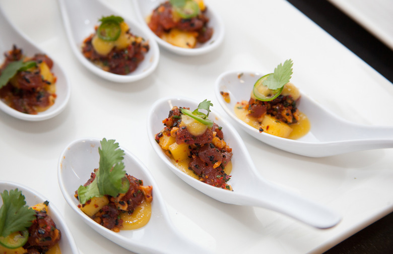 Tuna poke is combined with cashews, yuzu, and mango for a bright, flavorful bite.