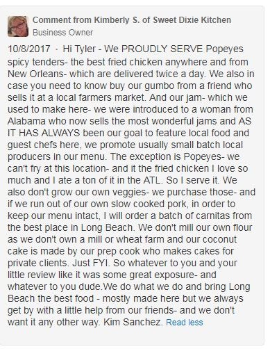 The restaurant's owner, Kimberly Sanchez, responded to the Yelp review (and several others that soon followed) by claiming that there's nothing wrong with buying fried chicken from Popeyes and reselling it, comparing it to buying, say, vegetables and flour from outside vendors.