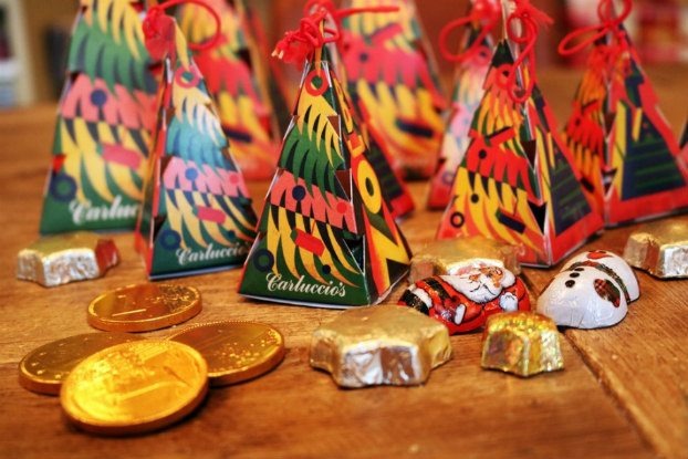 These bright, paper Christmas tree ornaments are filled with lovely foil-wrapped gianduja milk chocolate candies. Each paper tree can hang on your fir tree as an ornament, until someone finally succumbs to temptation and tears open the ornament for the chocolates inside. Large includes foil wrapped chocolate coins, Santas, and snowmen, while the smaller size includes just Santa and snowmen. These just scream Buon Natale!