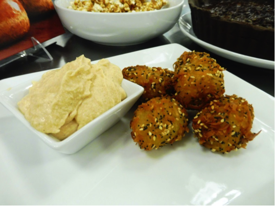 First dish on the menu was Smack Caramel Corn, homemade caramel popcorn infused with bacon. After the completion of each dish, samples were distributed to guests as the band played "Take on Me" by A-ha . The second dessert was Banana Fritters with Tahini Caramel Cream, a crowd pleaser for cocktail parties. The grand finale was the Smoky Chocolate-Ginger Ganache Tart. Midway through rolling chocolate dough, he suddenly stopped for a pop quiz session about baking jargon and kitchen appliances. The audience gladly responded back with their best answers. Chef Iuzzini shared stories about his childhood and travels in France while the audience tasted delicious samples of the finished products. He shared his best practices on how to craft the perfect crust, and the audience "oohed" and "aahhed," to the murmurs of, "Why didn't I think of that?" The cooking show was twice as funny as the Spazmatics repeatedly interjected with pre-recorded sounds of laughter, claps, and special audio effects during Chef Iuzzini's storytelling.